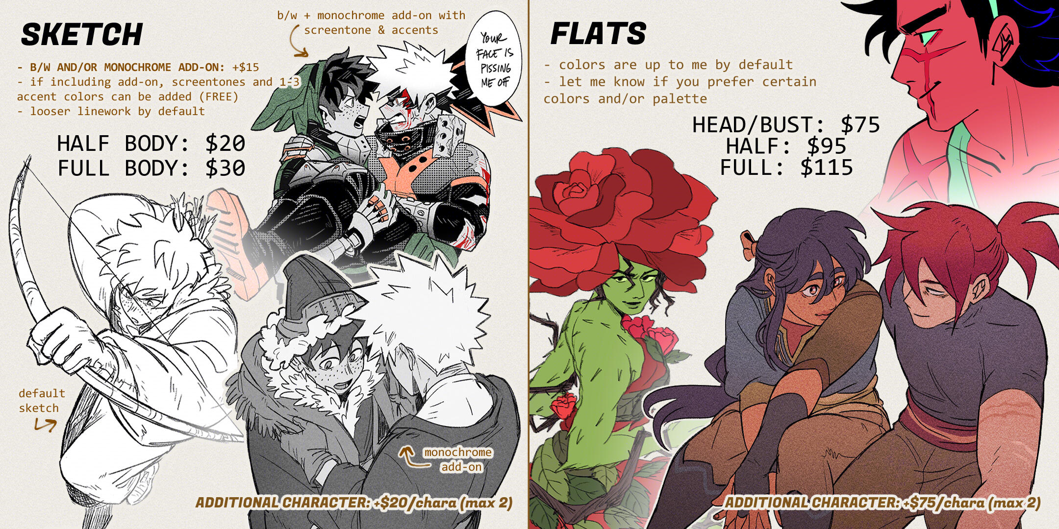 | Flats | $75 | $95 | $115 | $75/character | By default, flat color uses either character's base colors or up to me. |